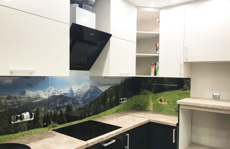 Кухонный фартук выполнен на стекле Оптивайт 6мм с применением УФ печати и установленный на силикон