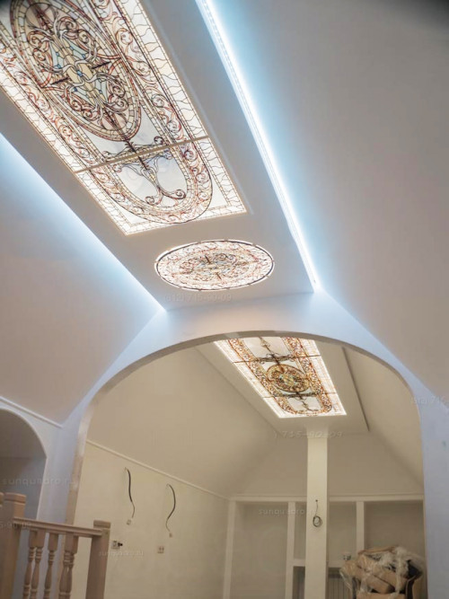 Потолочный витраж выполнен на светорасеивающем поликарбонате с применением УФ печати